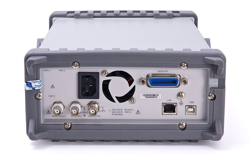 На задней стенке корпуса находятся разъёмы для подключения кабеля питания, разъём внешнего запуска, входной разъём для подключения внешнего тактового генератора, интерфейсы USB и LAN.