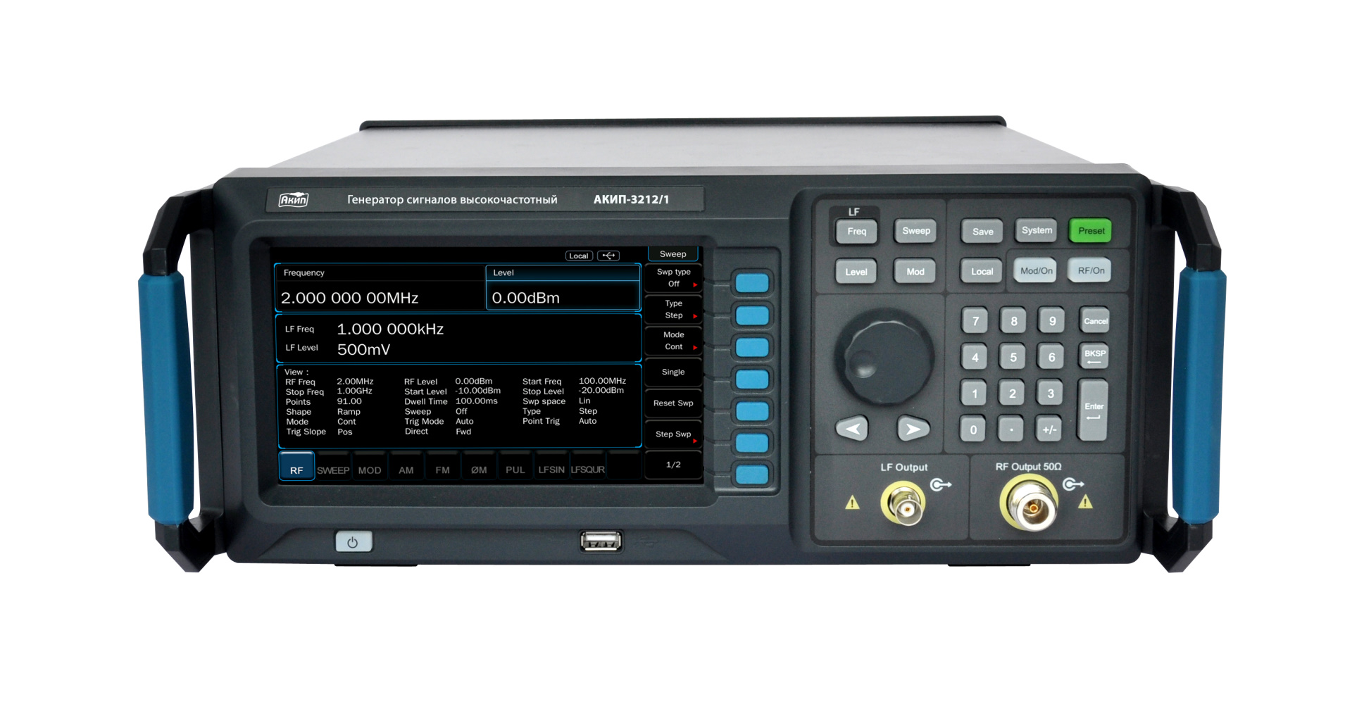 Пределы допускаемой относительной погрешности установки частоты | Стандартно: ±5×10¯⁶ Опция OCXO: ±5×10¯⁷ Есть вход сигнала внешней опорной частоты 10 МГц |