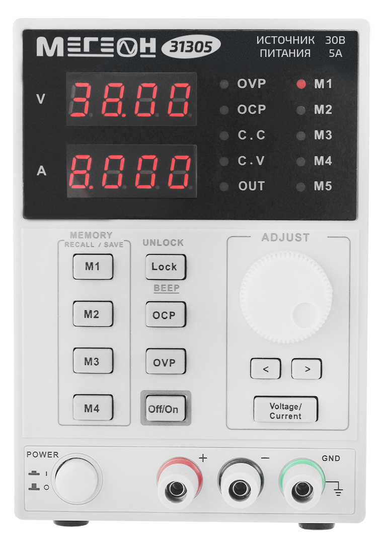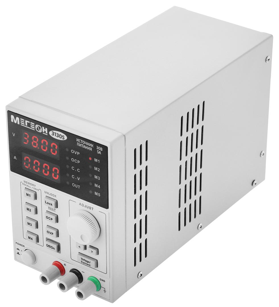 МЕГЕОН 31305 оснащен 4-х разрядными независимыми светодиодными индикаторами выходного напряжения и тока, которые позволяют легко отслеживать параметры питания в реальном времени. Кроме того, он оснащен разъемами для подключения различных нагрузок и датчиков, что позволяет легко интегрировать его в электронные системы.